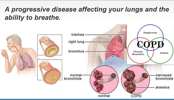 Chronic Obstructive Pulmonary Disease is an umbrella term used to describe progressive lung diseases including emphysema, chronic bronchitis, refractory (non-reversible) asthma, and some forms of bronchiectasis. This disease is characterized by increasing breathlessness.